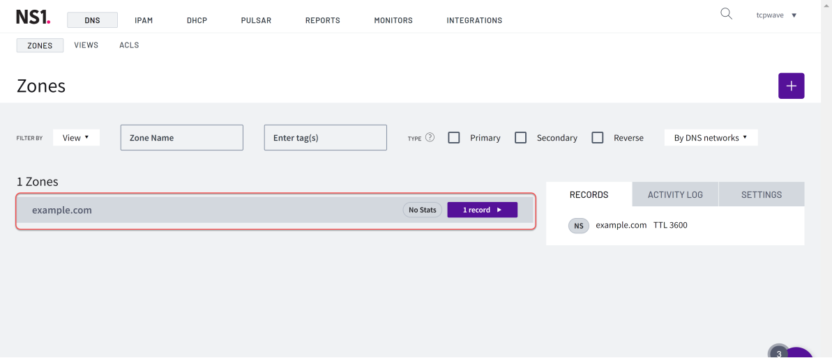 With the newly added NS1 API integration, the DNS zone example.com is created on the NS1 console as shown: